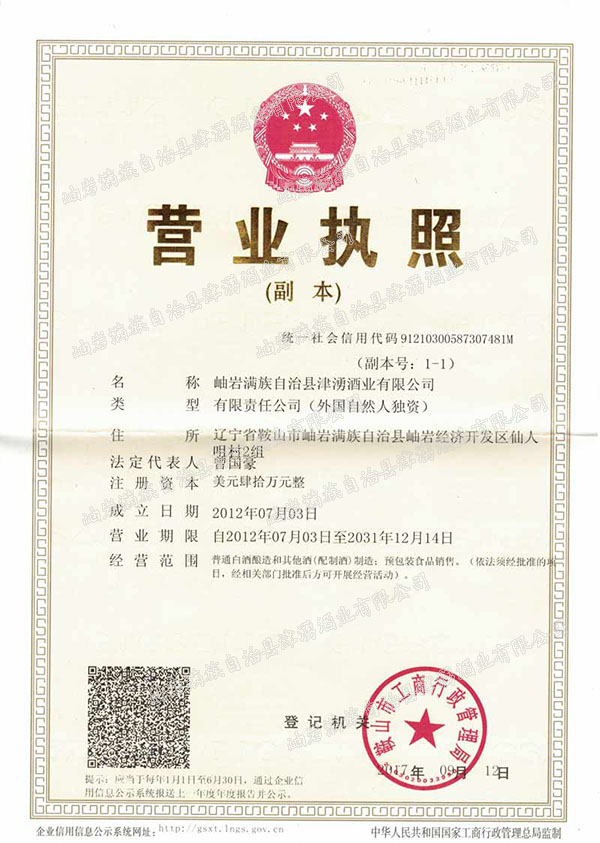 岫巖滿族自治縣津湧酒業(yè)有限公司位于風(fēng)景秀麗、青山綠水的岫巖縣前營(yíng)鎮(zhèn),公司占地3500平方米,年生產(chǎn)能力100噸釀造醬香原漿白酒。2013年公司產(chǎn)品“津湧豪酒”曾獲得遼寧省“遼寧放心名酒”稱號(hào),公司現(xiàn)正研發(fā)配制酒生產(chǎn)項(xiàng)目,為公司發(fā)展提供技術(shù)保證。公司的注冊(cè)資本全部由美籍華人出資。